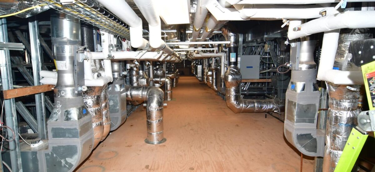 As a vivarium, the building required specialized HVAC systems to tightly control temperature, humidity, air quality, and room pressurization to meet animal care and research standards. Each space was designed to maintain either positive or negative pressure, and all major HVAC systems were built with full redundancy to ensure uninterrupted operation. This resulted in an unusually high concentration of mechanical equipment housed in the mezzanine and required extensive coordination and detailed air balancing.